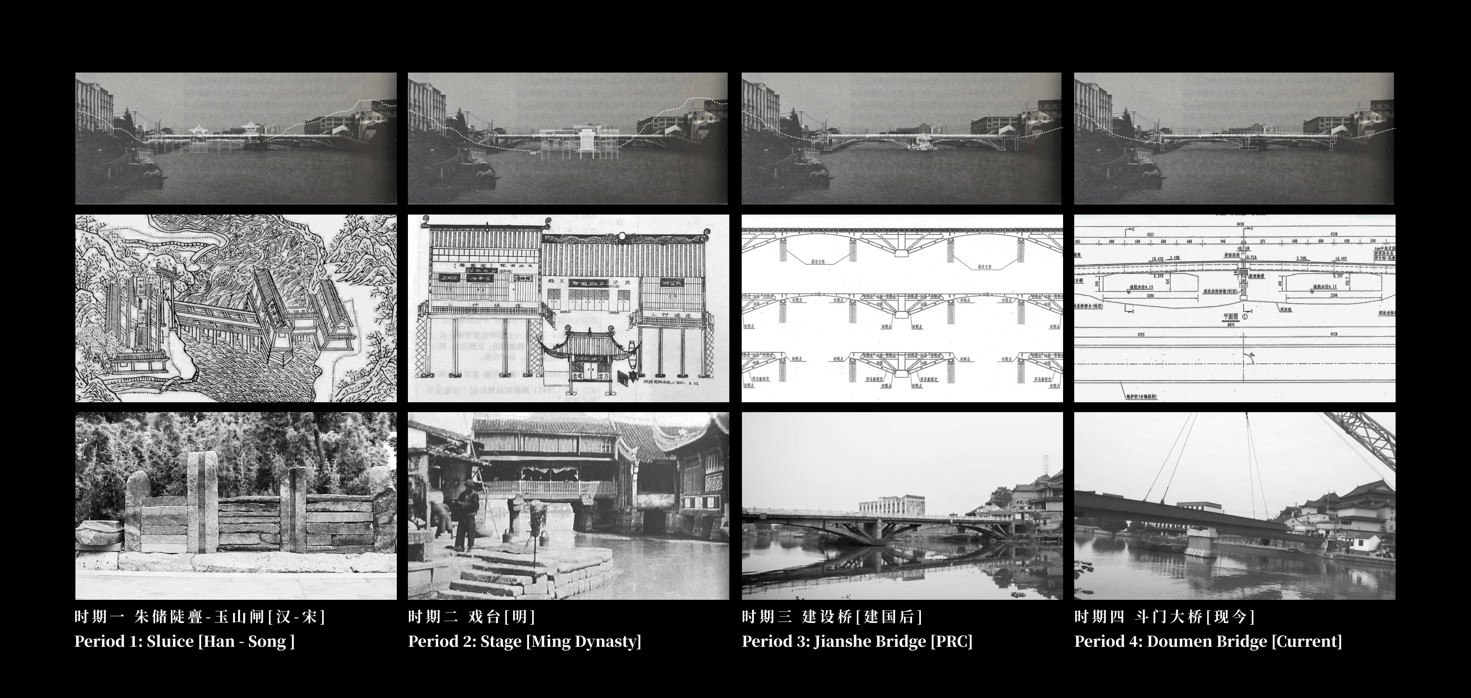 The project site is located at the heart of Doumen’s historic district, beneath Doumen Bridge and adjacent to the remains of an old theater stage. Doumen Bridge serves as a crucial connection between the northern and southern parts of Doumen, yet it currently accommodates only vehicular traffic, leaving no space for pedestrians and fragmenting the town’s walkability. At the same time, the old theater stage, once an important cultural landmark, has gradually faded into obscurity. The challenge of this project was to reconnect infrastructure, daily life, and nature in a way that integrates rather than isolates historical elements.