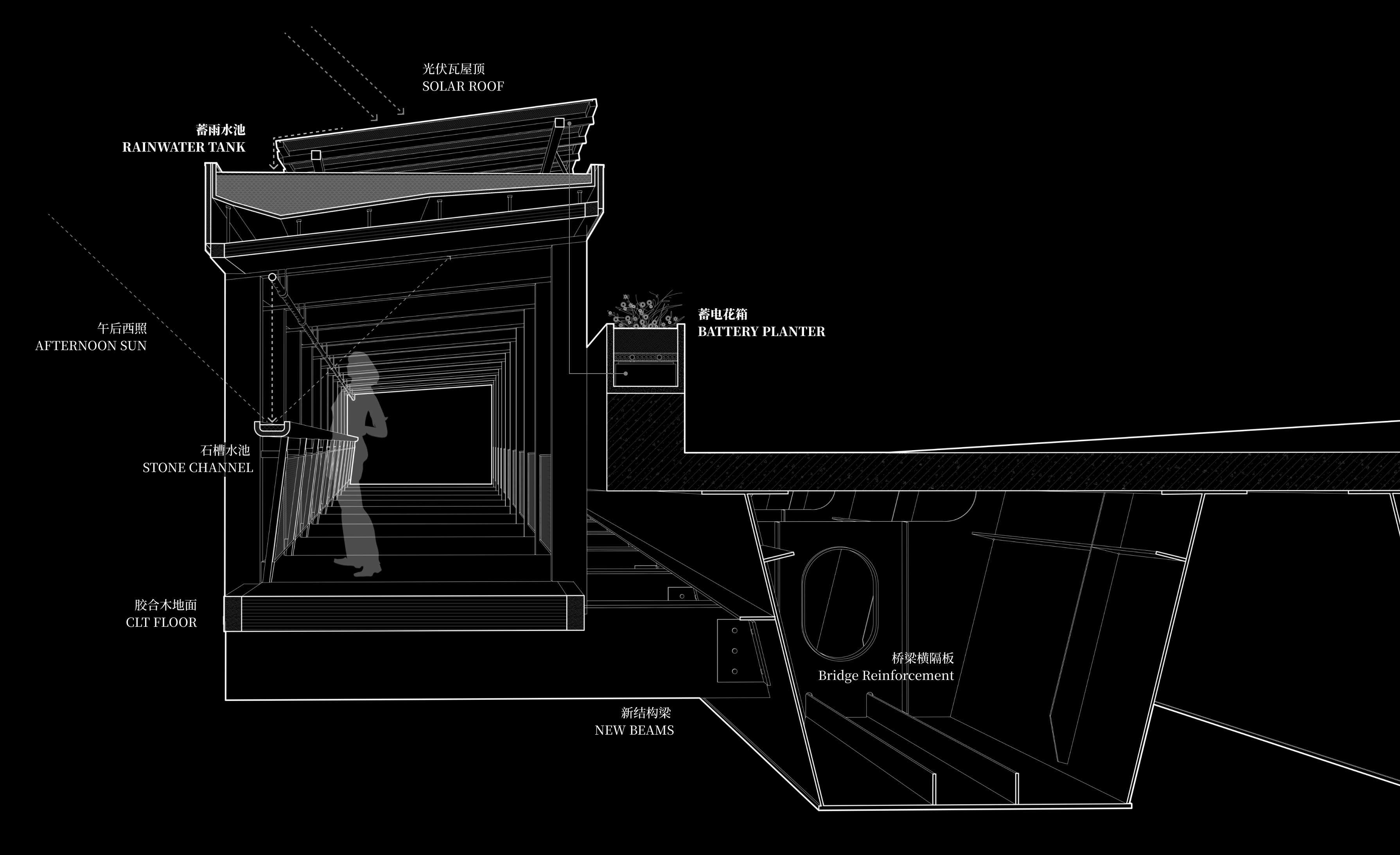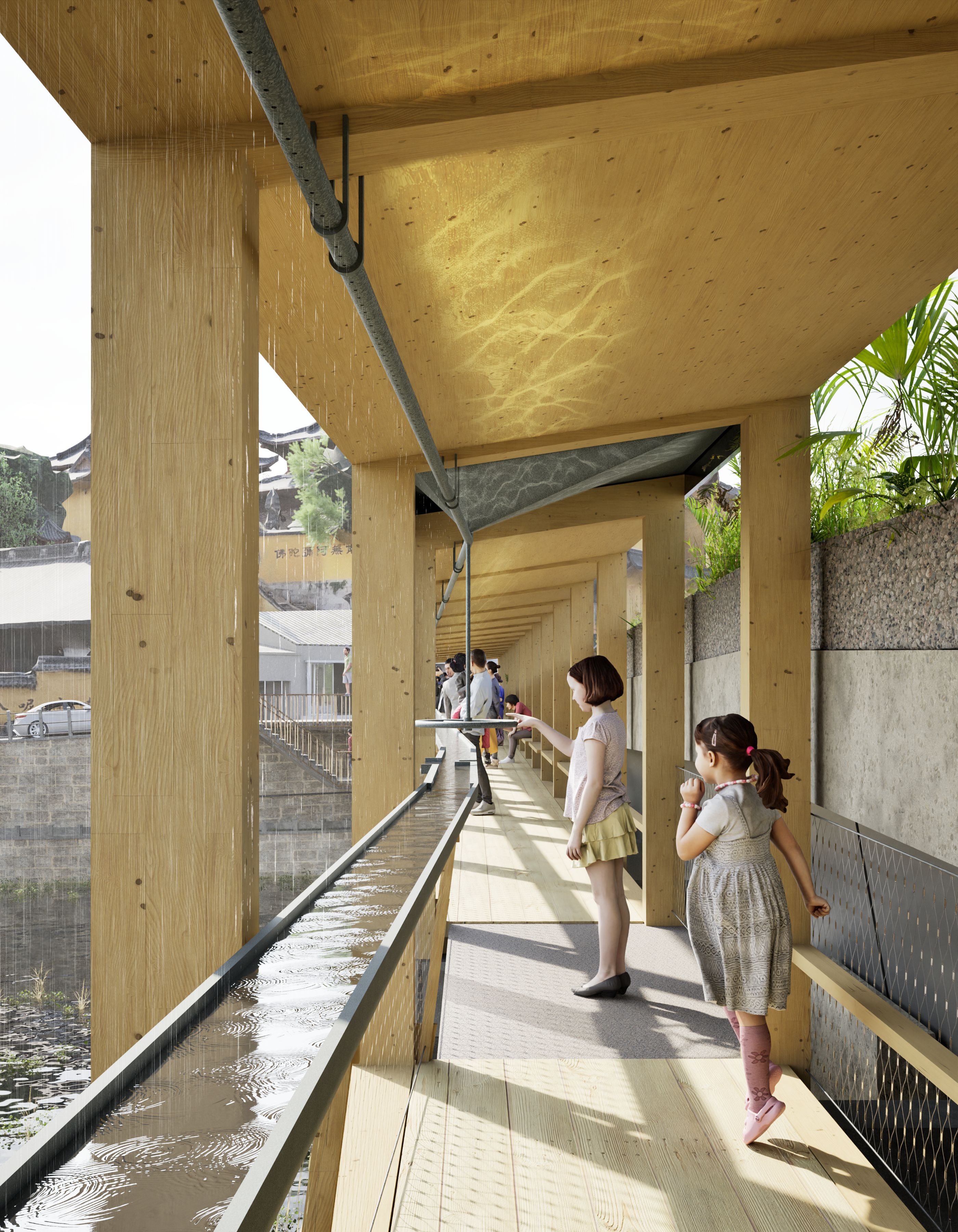 步行桥的顶棚被设计为一个雨水收集系统,在雨天时,雨水被储存至屋顶水箱。公众可以在桥中央手动转动水闸,开启水流。届时,雨水会从桥檐流下,形成连续的雨帘,再沿着桥栏收集并汇聚至桥中央的落水口,最终形成一道雨瀑,落在戏台遗址的纪念碑石上。这一装置不仅让公众以直接的方式参与场地的变化,也通过水的流动,使陡亹的水文化在当代语境下得以重现。