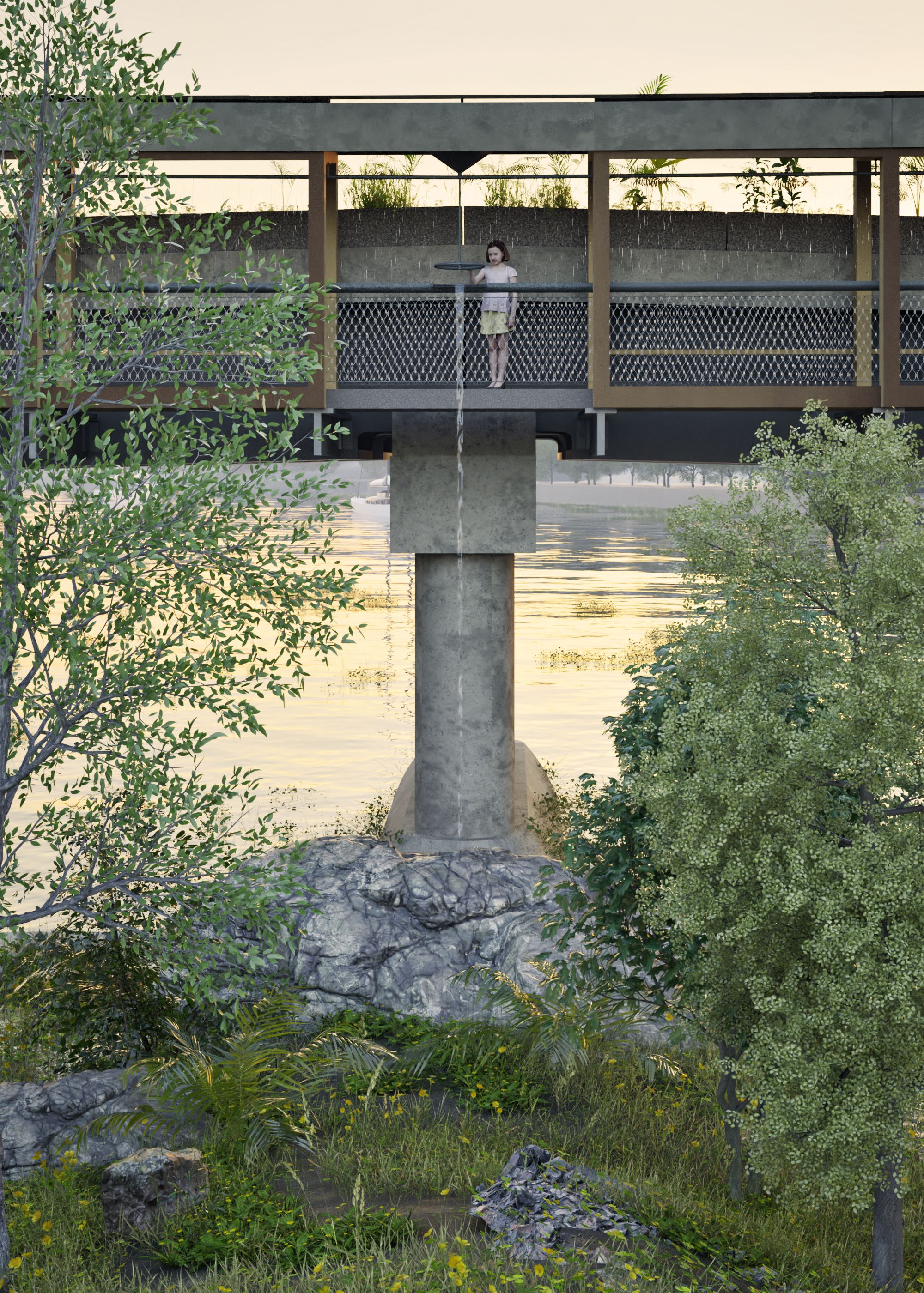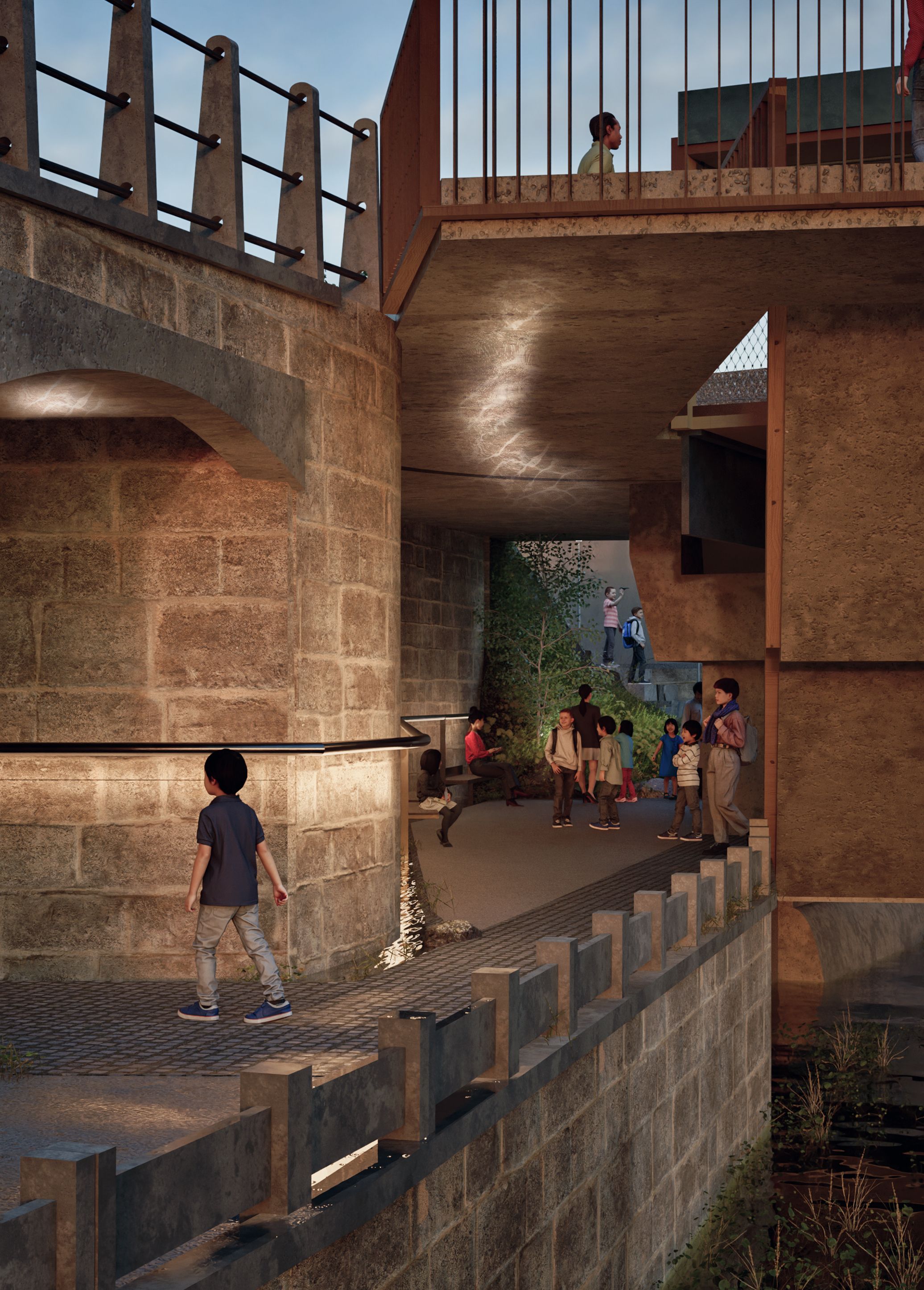 For the treatment of the theater remains, we chose a restrained approach that integrates rather than monumentalizes the site. Instead of turning it into a static relic, we sought to return it to nature, allowing it to exist as a river island covered in greenery rather than a detached historical marker. To further evoke Doumen’s rich water culture, we incorporated an interactive water gate installation into the pedestrian bridge’s shading canopy.
