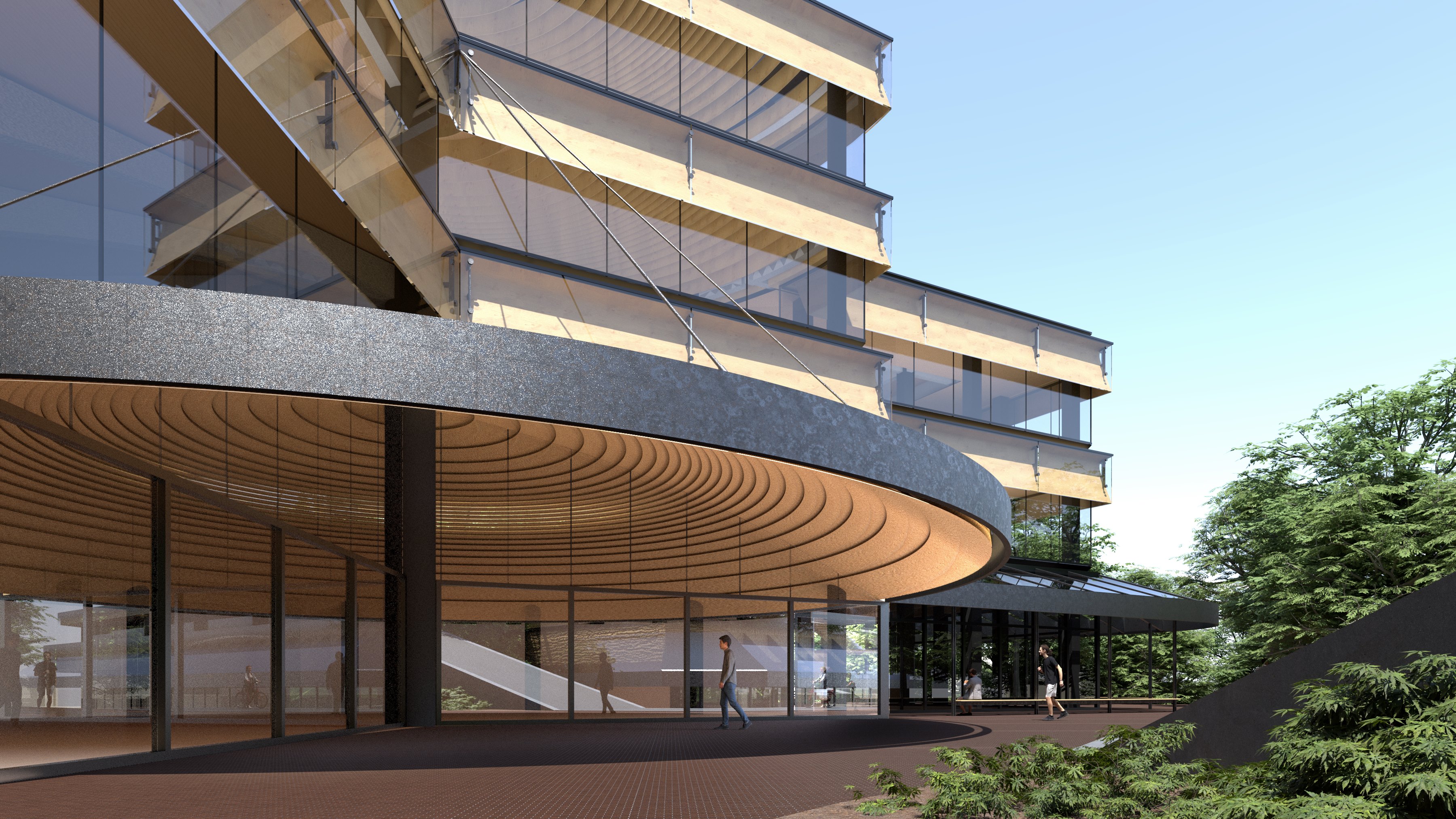 At the entrance of the building, we incorporate a cantilevered circular canopy. Supported by two tension cables above it, the design of the canopy abstractly symbolizes the moment when a chess piece is held between two fingers and about to be placed on the board. Meanwhile, the bottom of the canopy gently rises and hovers above the entrance hall, which resembles the shape of a chess piece and subtly hint at the building's identity as a chess academy.