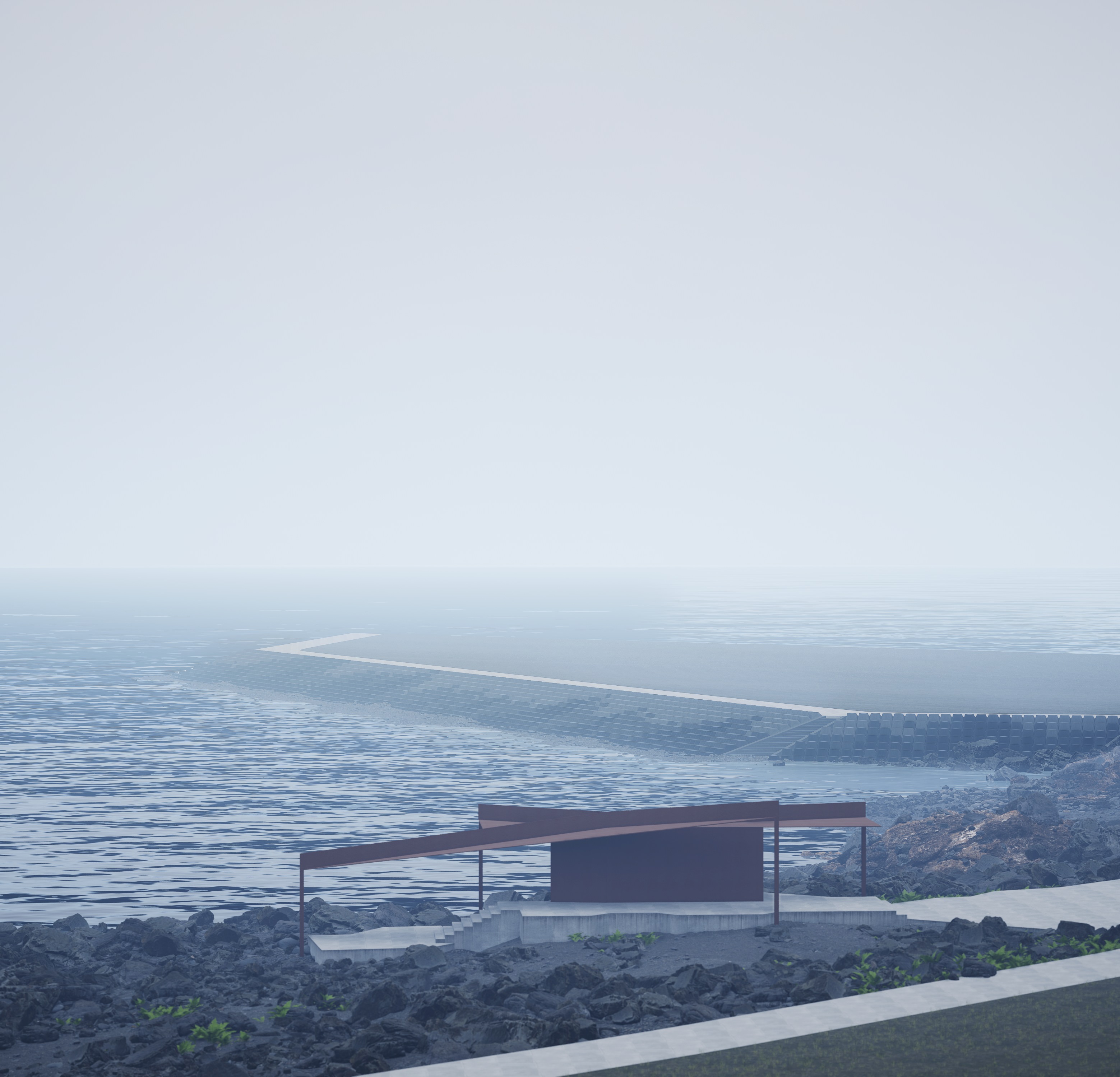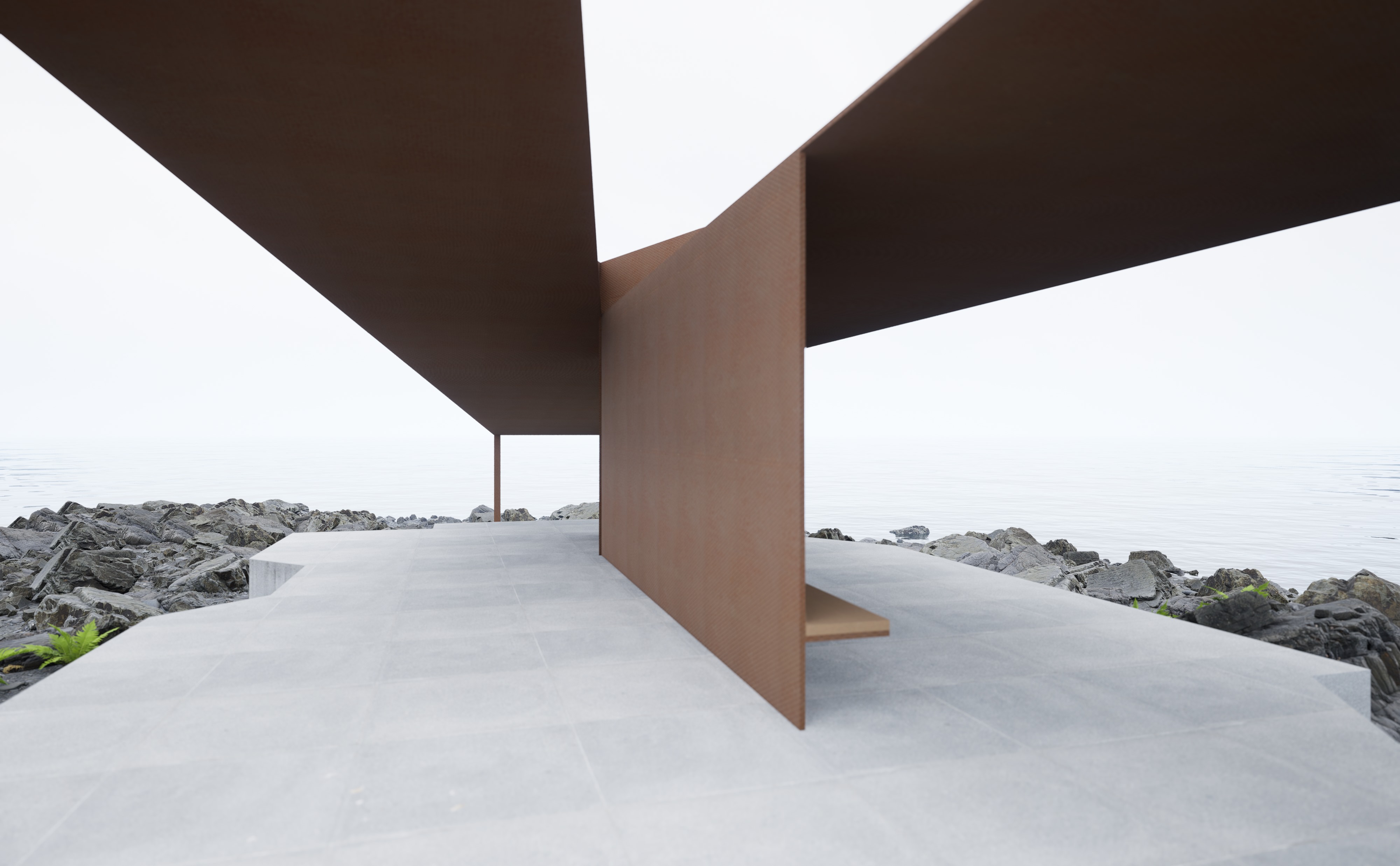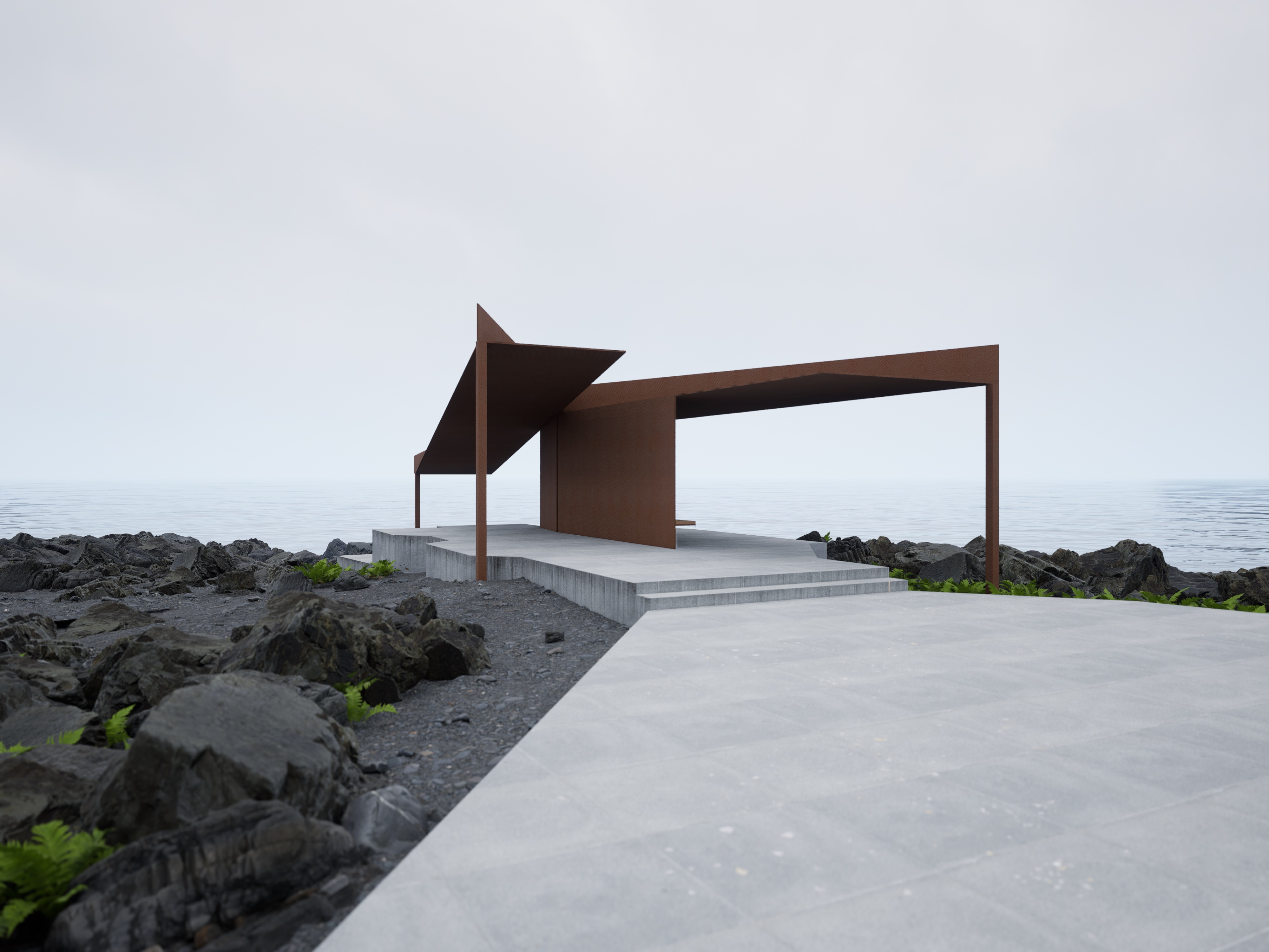 该项目位于宁波象山海边,为游客提供一个宁静的休息和冥想的场所。亭子由两个交叉的屋顶组成,一个水平伸展,另一个倾斜向海面。这种设计创造了两个方向向量:水平的屋面引导观者望向象山壮美的海岸线,而倾斜的屋面则引导人们的目光和动势走向大海。这个简单的概念通过耐候钢版构成的抽象结构呈现出来,仿佛海岸线和大海的自然力量在此被捕捉并凝固。