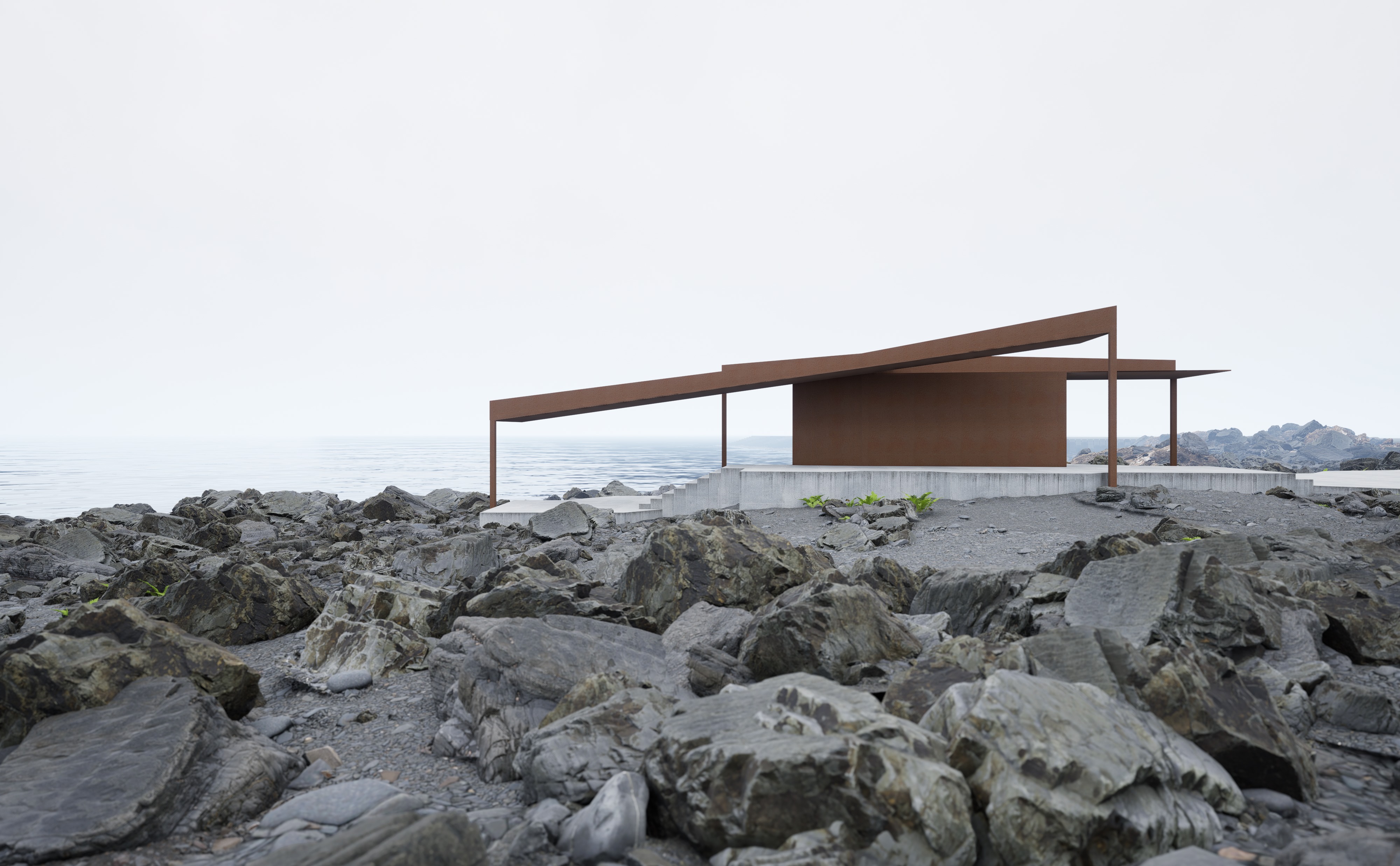 Located by the seaside in Xiangshan, Ningbo, this project aims to provide visitors with a tranquil space for rest and meditation. The design of the pavilion is composed of two intersecting roofs—one extending horizontally and the other slanting towards the sea. The horizontal roof guides the viewer’s gaze towards the magnificent Xiangshan coastline, while the slanted roof directs both the gaze and movement towards the ocean. The structure is made of Corten steel plates, as if the subliminal forces of the coastline and the sea are captured and reified in this place.